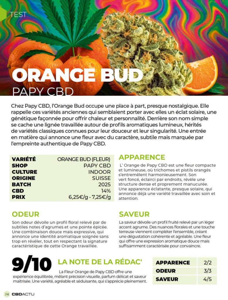9/10 au banc de test !!. Autant dire que Fred avait retrouvé l’odorat ce jour-là 😂 L’Orange Bud Indoor Papy CBD brille dans le magazine CBDACTU n°20 de janvier 2026, dans la célèbre rubrique « L’œil de Fred ». Retrouvez le détail du test dans la suite de cet article…